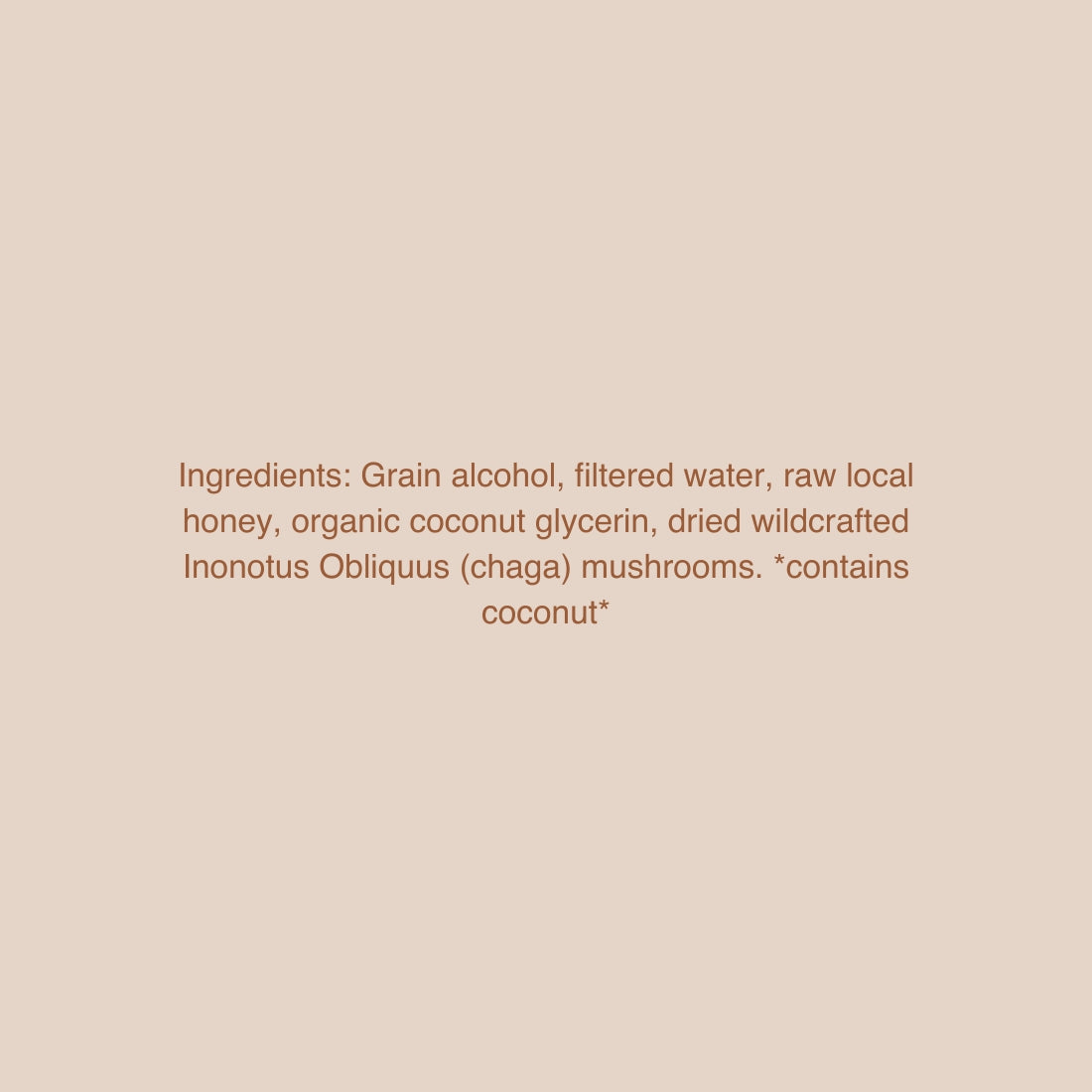Grain alcohol, filtered water, raw local honey, organic coconut glycerin, dried wildcrafted Inonotus Obliquus (chaga) mushrooms. *contains coconut*